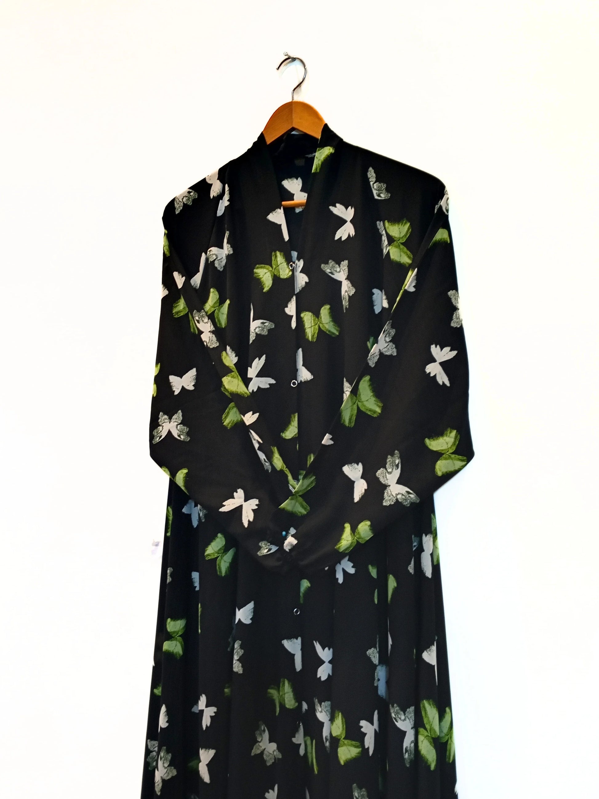 Design: Front-open abaya with button-down closure, featuring a scattered butterfly print that adds a graceful, nature-inspired charm.
