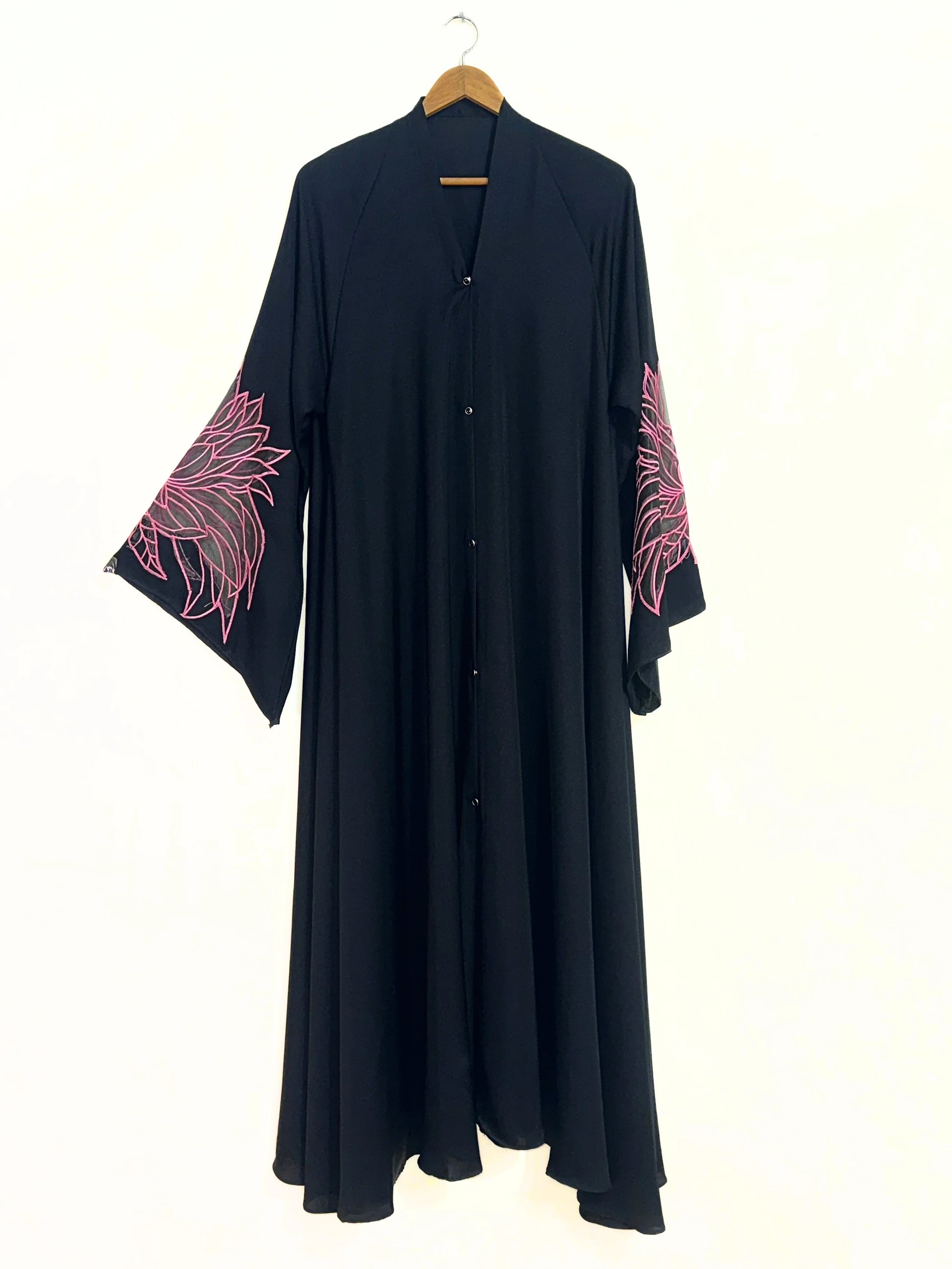 Design: Front-open abaya with button closure and statement embroidered wide sleeves for an elegant look.