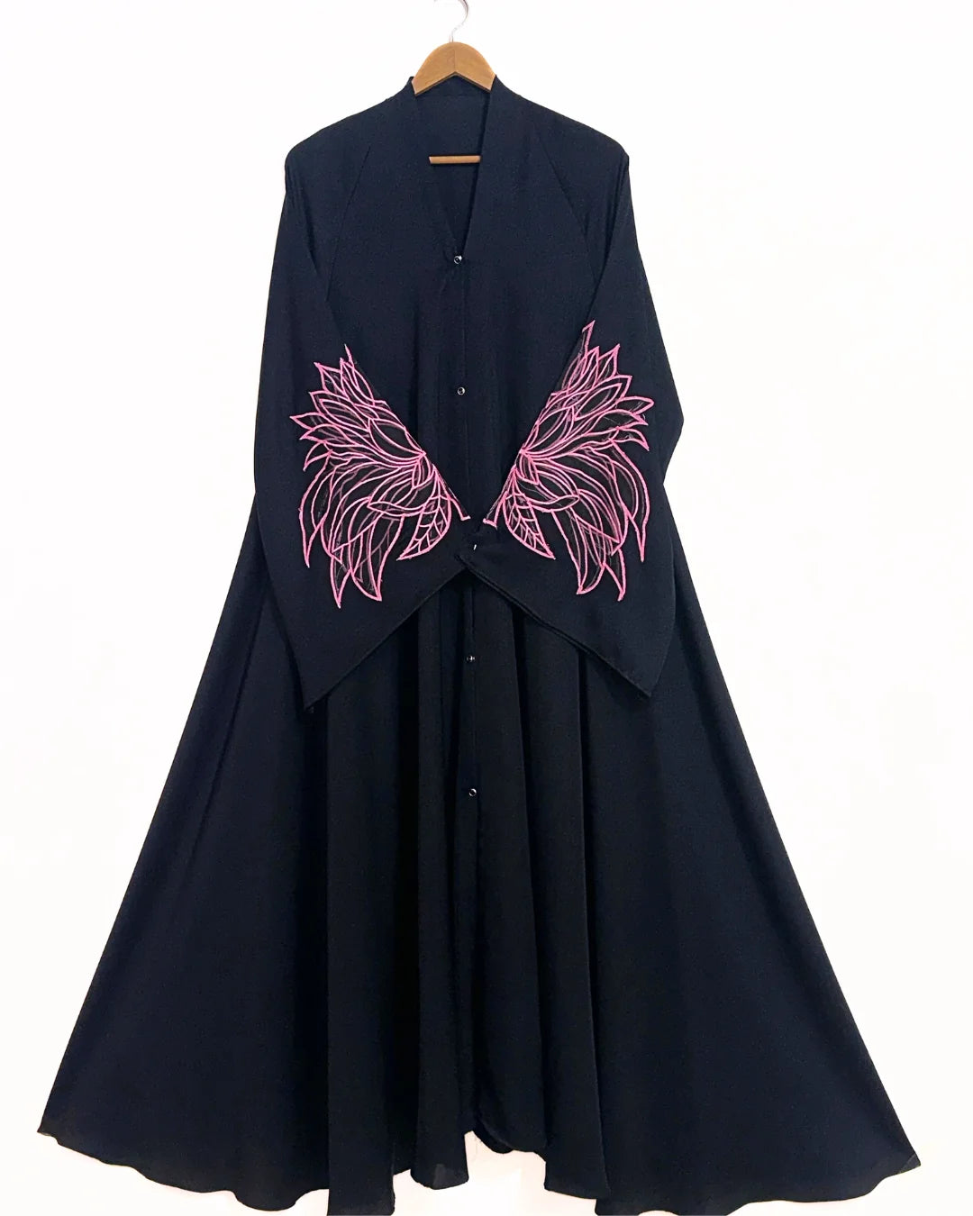 Pink Wings Embroidered Front Open Long Flare Abaya